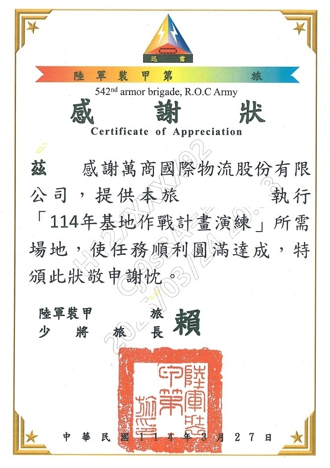 萬商國際物流支持全民國防,獲陸軍裝甲旅感謝狀